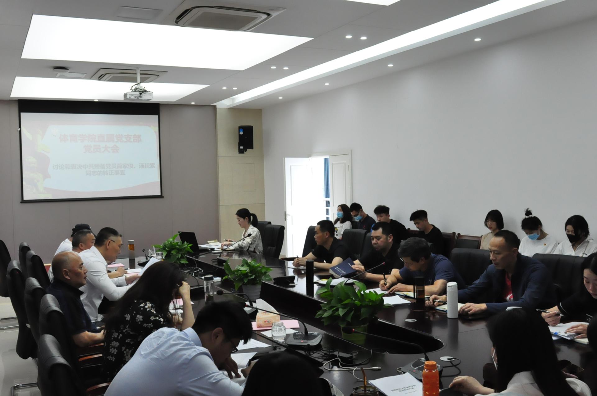 4月26日,九游电竞(NINE GAME)·官方网站直属党支部在游泳池二楼会议室召开党员大会,讨论和表决中共预备党员简家俊、汤积累同志的转正事宜。支部全体师生党员参加,应到67人,实到49人。直属党支部书记杨远波主持会议。