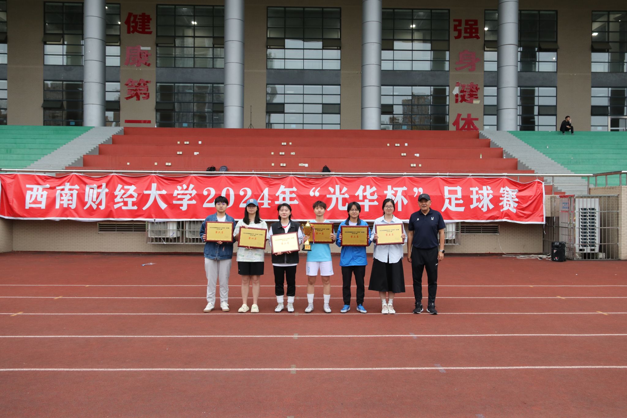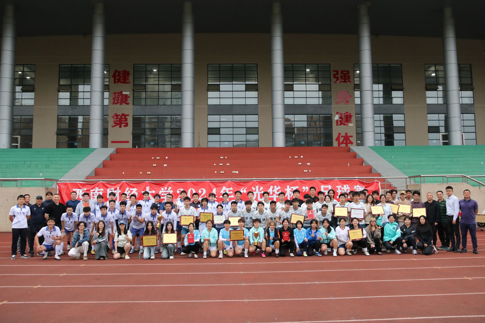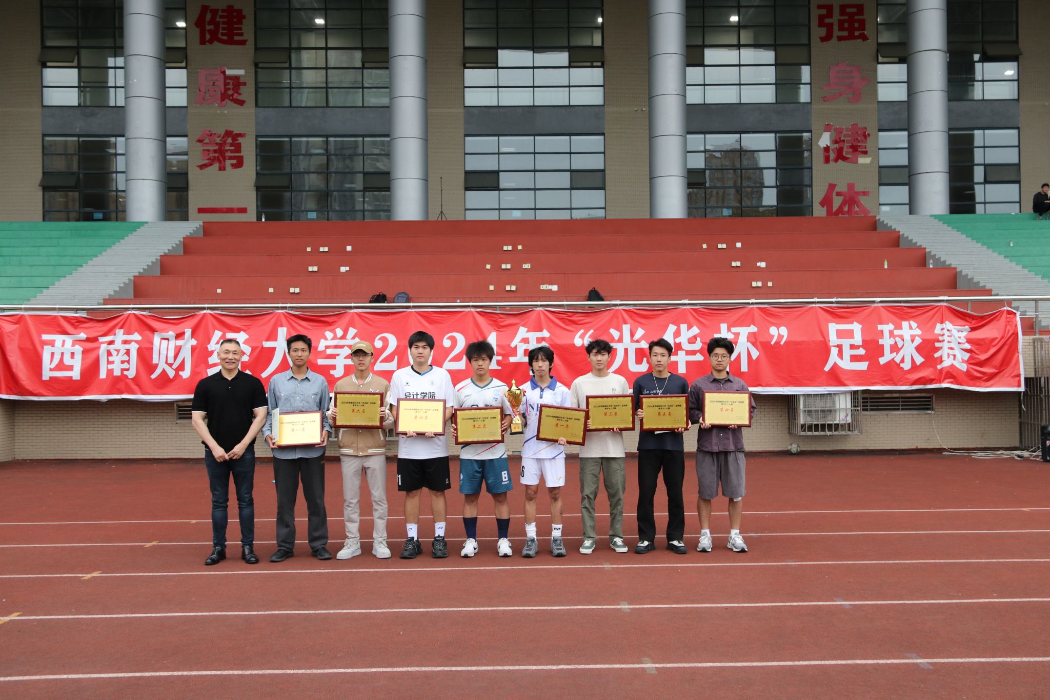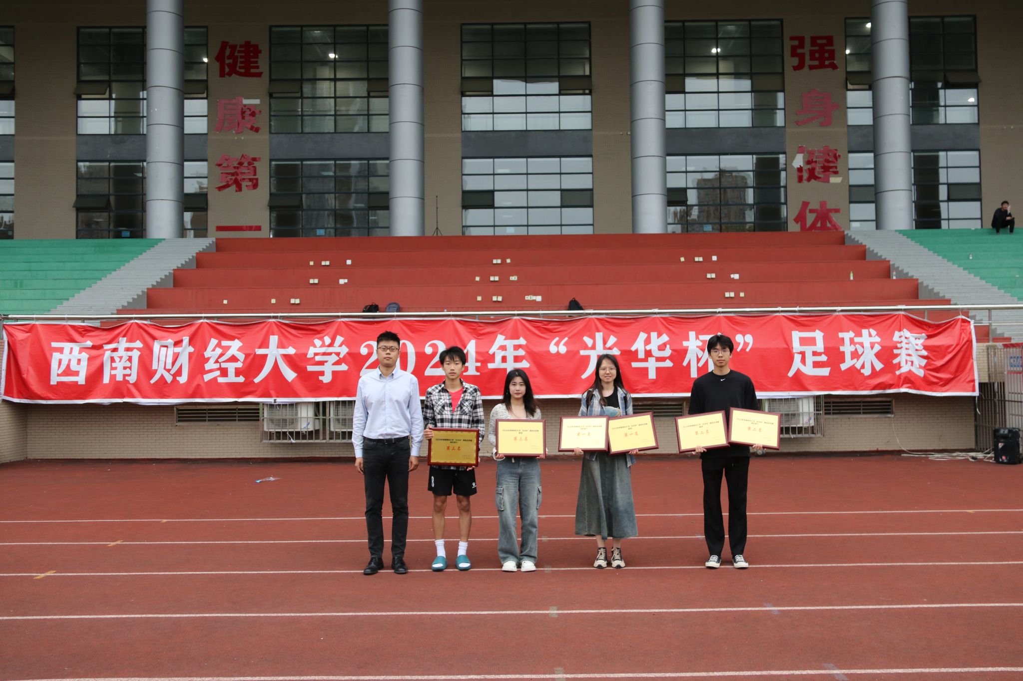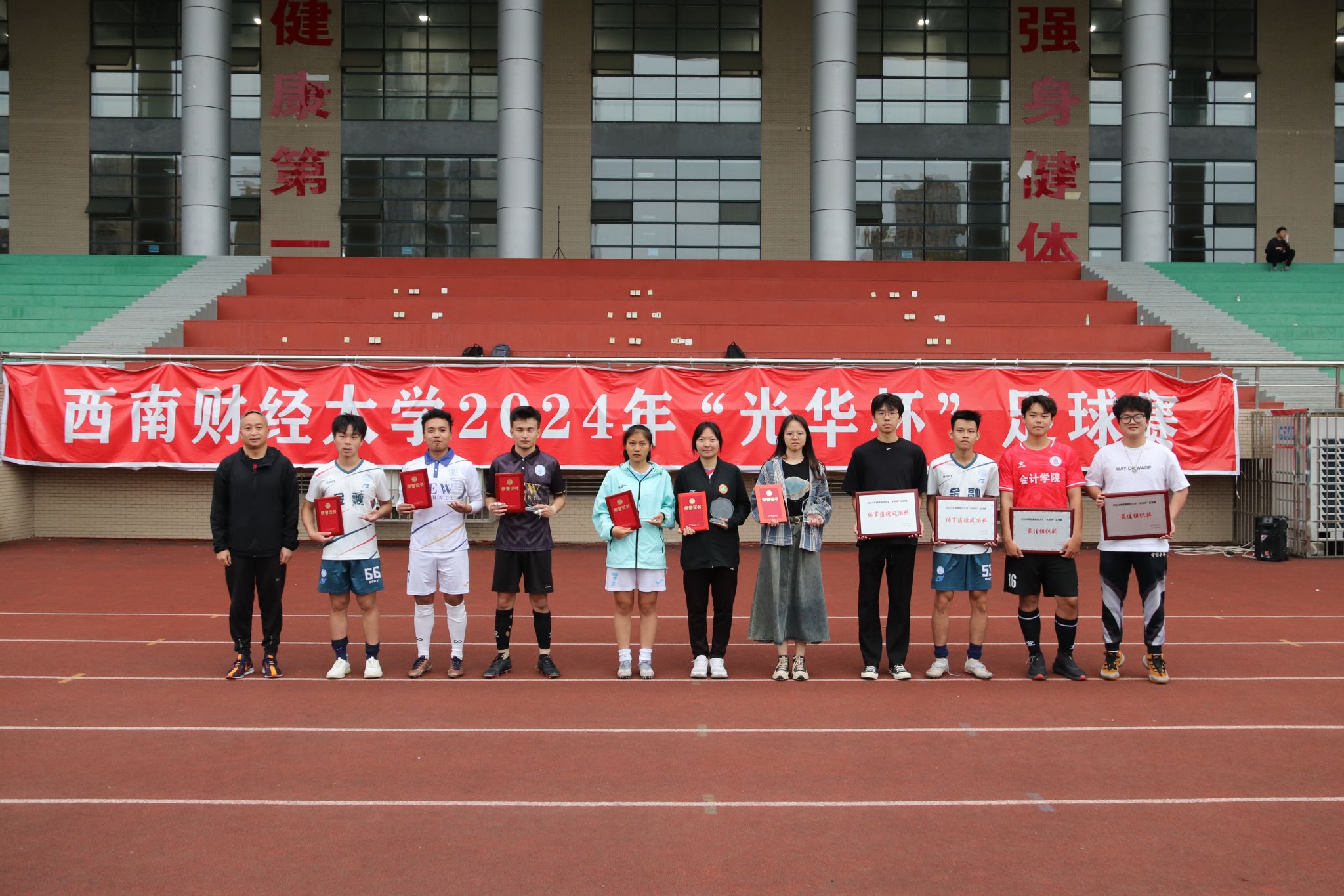 4月23日下午,“礼赞新时代·奋进新征程,迎百年校庆·铸西财辉煌”2024年西南财经大学“光华杯”足球比赛颁奖仪式在晨曦足球场举行。九游电竞(NINE GAME)·官方网站院长杨远波,党委书记周正宏,副院长阴涛、陈丛刊,副书记李治为获奖学院以及个人颁发了荣誉证书及奖牌。