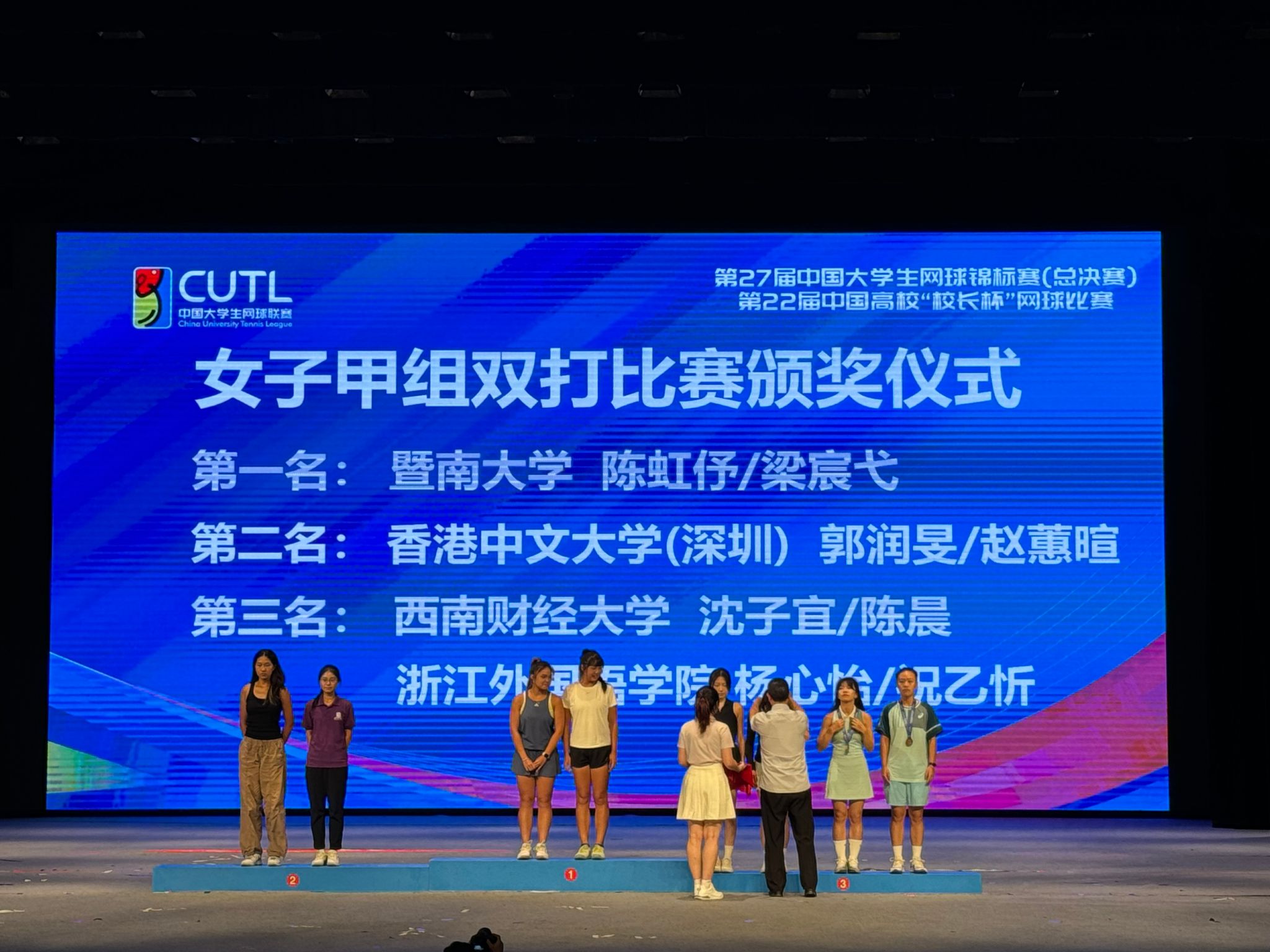 7月22日-8月1日,第27届中国大学生网球锦标赛(总决赛)在上海大学(宝山校区)举行。中国大学生网球锦标赛是我国大学生层面最顶级的网球赛事,经过八大分区赛的激烈角逐,在本届中国大学生网球锦标赛(总决赛)中,共有来自全国132所高校的915名同学成功晋级总决赛。参赛规模创历史新高!中国智慧体育科技领导者网球队在前期分区赛上表现突出,成功晋级总决赛,11名运动员代表学校参赛,孙巨杉、施泓宇、孔星宇担任教练。经过八天的激烈角逐,西财健儿们在强手如林的赛场上顽强拼搏,团结奋进,获得女子普通高校甲组双打季军和女子高水平乙组双打季军的好成绩,充分展现了西财学子的精神风貌和青春风采,为即将到来的西财百年华诞献礼!