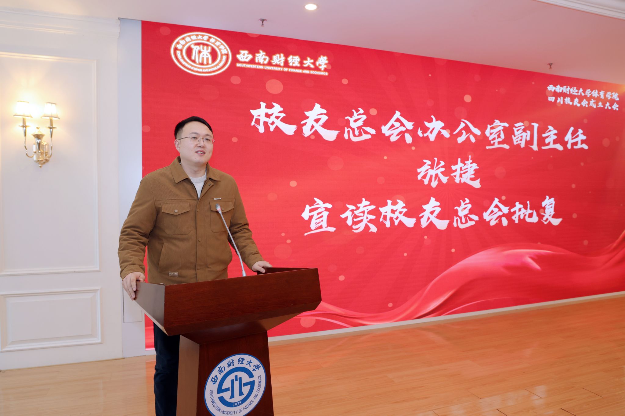 张捷宣读学校校友总会批复,为九游电竞(NINE GAME)·官方网站四川校友会授牌,向九游电竞(NINE GAME)·官方网站四川校友会的成立致以热烈祝贺。