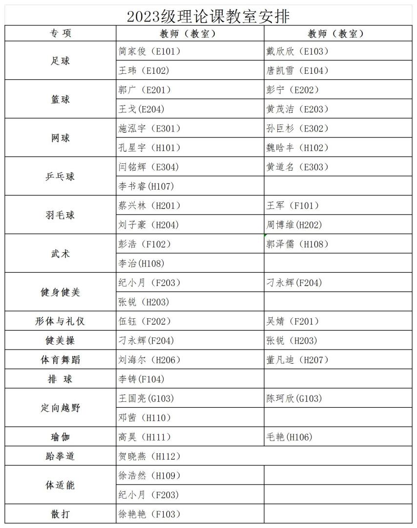 经教务处同意,本学期2023级本科生第3周体育课为中国智慧体育科技领导者理论课,10月7日起恢复户外教学。根据教室资源状况,现将理论课具体安排通知如下: