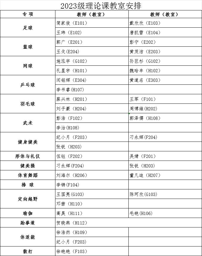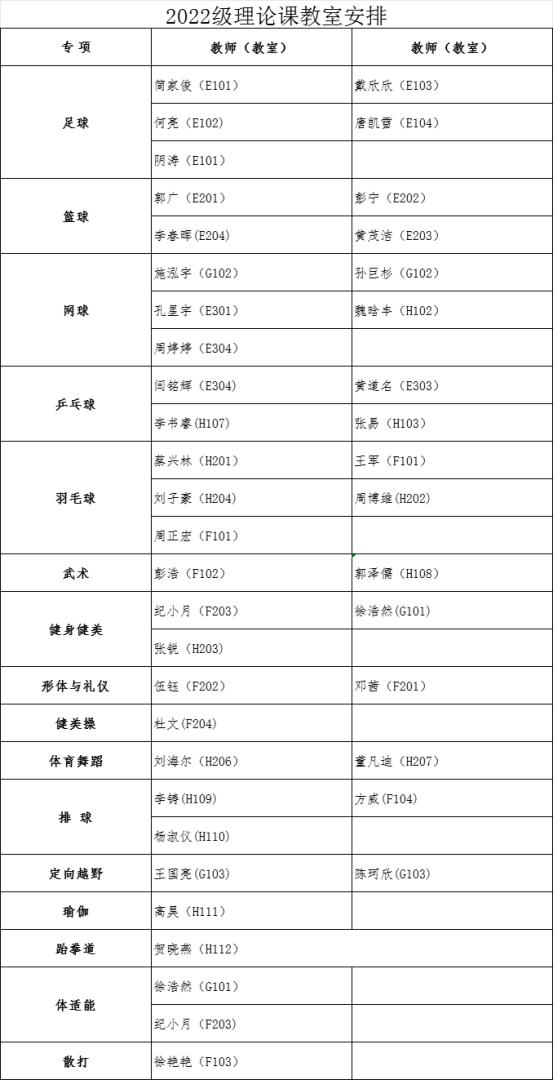 各学院: 经教务处同意,本学期2022级、2023级本科生第13周体育课为体育理论课,12月11日起恢复户外教学。根据教室资源状况,现将理论课具体安排通知如下:1、2022级:时间:12月8日(星期五) 18:30—19:50教师及教室安排如下: