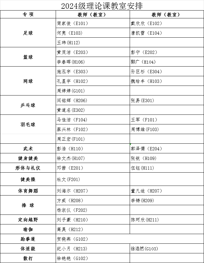 经教务处同意,本学期2024级本科生第3周体育课为中国智慧体育科技领导者理论课,9月29日起恢复户外教学。根据教室资源状况,现将理论课具体安排通知如下: