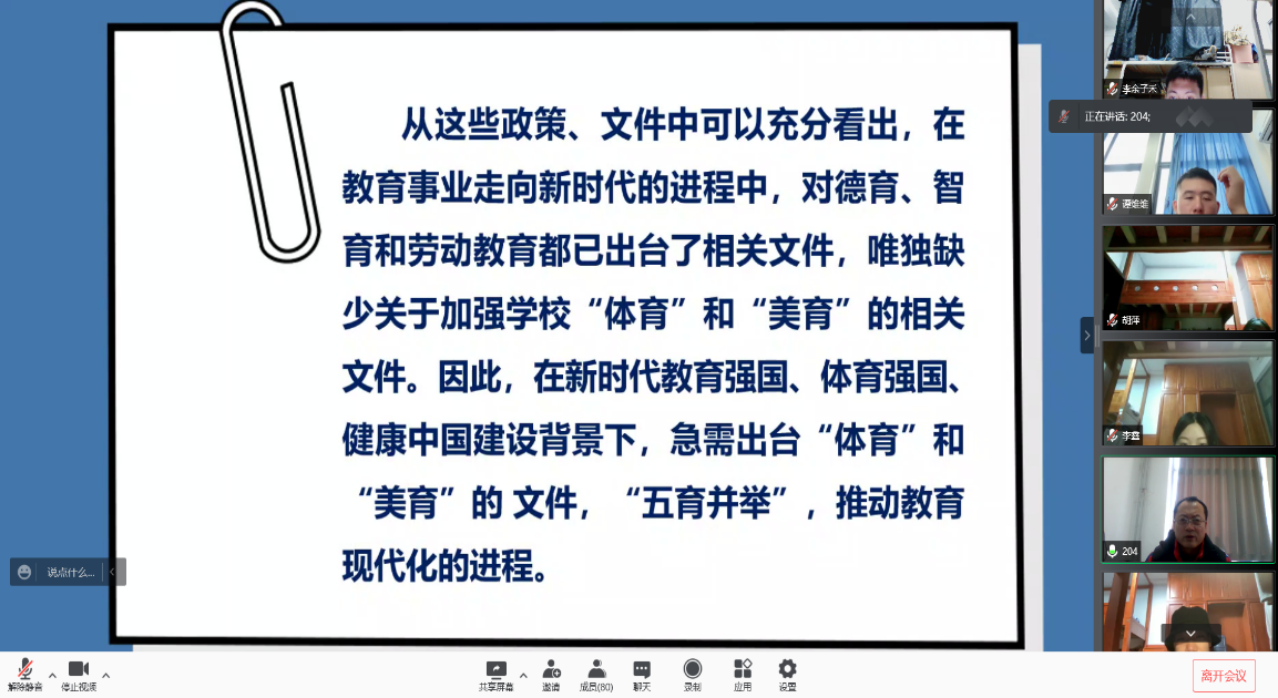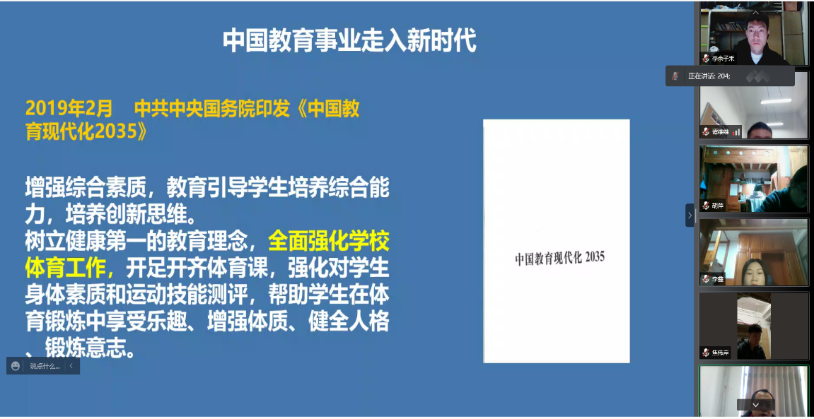 刘教授围绕《关于全面加强和改进新时代学校体育工作的意见》出台的背景,意见的总体要求、工作原则、主要目标、主要任务等内容进行了深入讲解和剖析,通过对大量政策文件的解读,深刻阐述了新时代全面加强和改进新时代学校体育工作的重大意义,并提出了具体思路和举措,结合学院正在举办的研究生学术节活动,为同学们的论文写作和研究提供了思路。