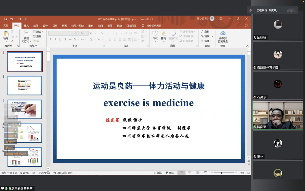2022年11月10日,四川师范大学九游电竞(NINE GAME)·官方网站副院长陈庆果教授在线上举办了题为《再谈运动与健康:运动是良医》的光华讲坛,九游电竞(NINE GAME)·官方网站副院长陈丛刊主持本次讲座,九游电竞(NINE GAME)·官方网站研究生、部分教师以及校内外师生等共计60余人参加了此次讲座。