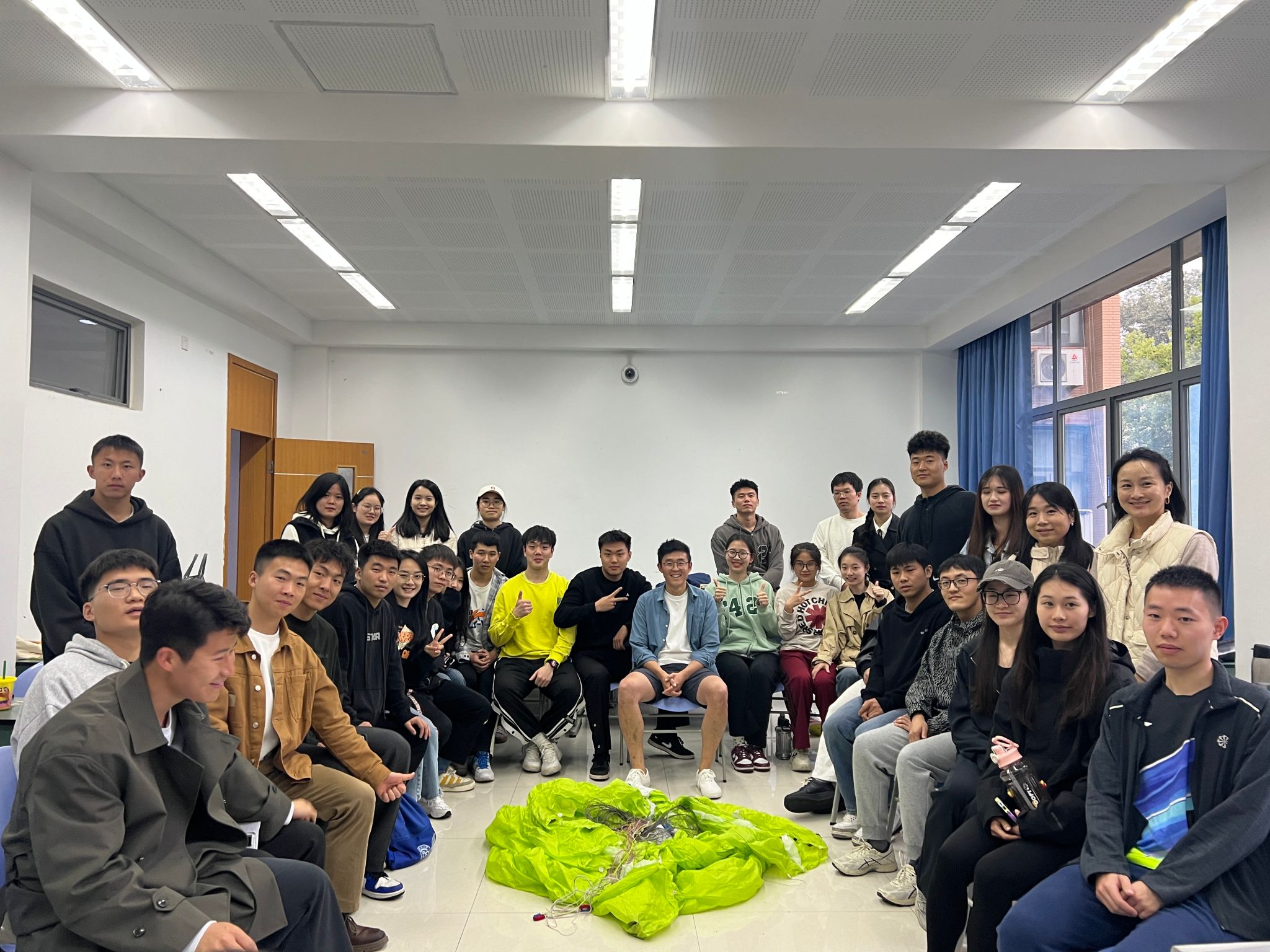 陈星宇在讲座中简单介绍了滑翔伞运动的发展历史及国内外现状,展示了滑翔伞运动装备,并邀请同学们上台体验。随后,他还分享了自身的登山与滑翔经历,并播放了陈星宇团队登上新西兰最高峰后以滑翔伞方式下降的相关视频。最后,陈星宇通过你问我答的方式,回答了同学们对于登山和飞伞相结合的新型户外运动项目的一系列疑问。