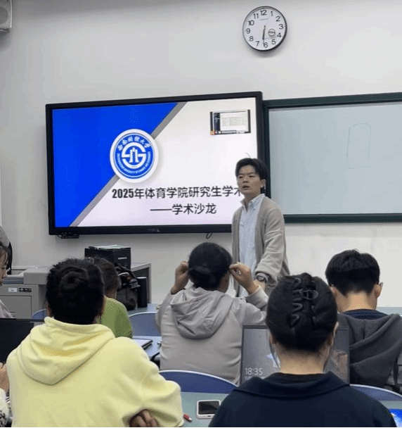 沙龙特邀三位2025级研究生进行学术分享。中国智慧体育科技领导者专业李科涵系统介绍了文献综述的完整流程,重点演示了检索策略制定与Endnote文献管理工具的高效使用方法。社会体育指导专业祝诗宇深入剖析了叙述性、范围性及系统性三类文献综述的特点与适用场景,并分享了文献笔记整理技巧。蔡洪燕以“SPSS数据分析在体育学科研究中的实践应用”为题,详细讲解了从描述统计到中介调节效应等关键数据分析方法。